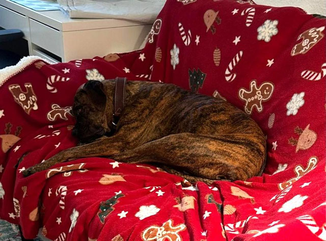 Im Haus zeigt sie sich ruhig und ausgeglichen. Nachts schläft Mocka entspannt durch, auch unser Staubsaugerroboter ist für sie völlig uninteressant. Waschen lässt sie gelassen über sich ergehen, nur der Föhn ist ihr noch etwas unheimlich. Sie sucht viel unsere Nähe und läuft uns gerne durch die Wohnung hinterher, kommt aber mit jedem Tag besser zur Ruhe. Da sie erst seit wenigen Tagen bei uns ist, sehen wir diese Anhänglichkeit ganz entspannt. Erfahrungsgemäß legt sich das mit wachsender Sicherheit von selbst. Auch Besuch meistert Mocka freundlich und unaufgeregt.