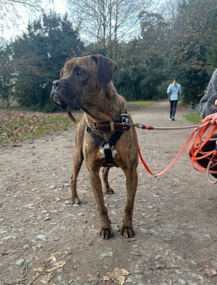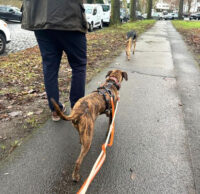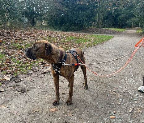An der Leine läuft Mocka sehr schön mit. Sie ist aufmerksam, reagiert sensibel auf Zug und passt ihr Tempo von selbst an. Einen Jagdtrieb konnten wir bisher nicht beobachten – weder Vögel noch Eichhörnchen interessieren sie besonders.
