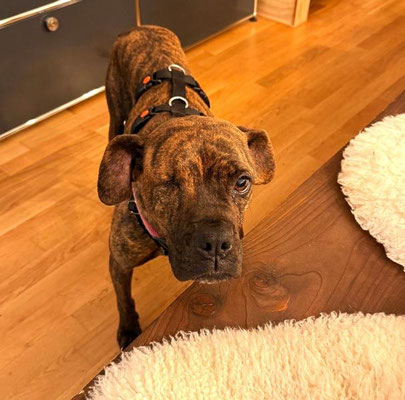 Mocka ist eine rundum tolle Hündin, die neben Nähe und Zuwendung natürlich auch ausgelastet werden möchte mit Spaziergängen, Bewegung und gern auch etwas Kopfarbeit. Hinweis: Mocka hat nur ein Auge.